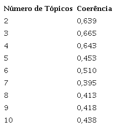 Com os dados da Tabela 12 podemos ver que 3 tópicos seria a melhor escolha para o modelo de LDA, pois possui a maior medida de coerência (0,6658).