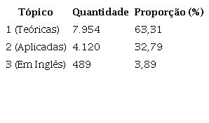 A grande maioria das disciplinas (63,31%) está com conteúdo focado na parte teórica, enquanto 32,79% das disciplinas têm um foco aplicado. Já as disciplinas na língua inglesa são menos de 4% das disciplinas relacionadas à estatística.