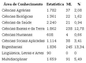 Uma outra questão são as disciplinas relacionadas a técnicas computacionais de Machine Learning, Data Science, dentre outras. Na Tabela 14 temos a quantidade de disciplinas relacionadas à estatística e todas as disciplinas relacionadas à ML. A proporção de disciplinas de ML em relação às disciplinas relacionadas à estatística deixa claro que essas disciplinas se concentram nas áreas de Engenharias e Ciências Exatas e da Terra.