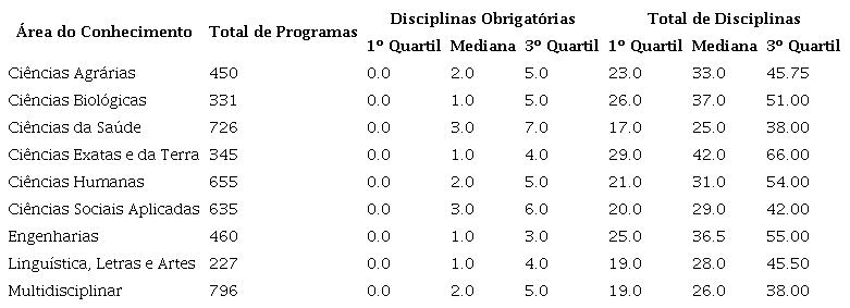 Na Tabela 1 temos, separadas por área do conhecimento, a quantidade de programas de pós-graduação, a quantidade de disciplinas obrigatórias e a quantidade total de disciplinas. Tanto para as disciplinas obrigatórias quanto para o total de disciplinas, estão o primeiro e o terceiro quartil, que correspondem, respectivamente, aos percentuais 25% e 75% das observações, e a mediana (segundo quartil).