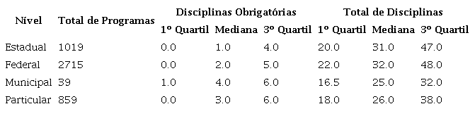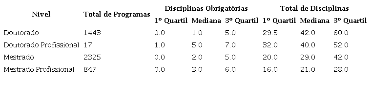 Pela mediana do total de disciplinas existe uma diferença entre os programas de doutorado e os programas de mestrado. Os programas de mestrado têm medianas de 21 a 29 disciplinas, enquanto os programas de doutorado têm medianas de 40 a 42. Apesar dos programas de doutorado terem a maior mediana de total de disciplinas, com 42, a maior mediana de disciplinas obrigatórias está nos programas de doutorado profissional. A mediana de disciplinas obrigatórias por programa não difere muito entre os mestrados acadêmicos e os mestrados profissionais. Vale ressaltar que a categoria doutorado profissional é recente no Brasil, vigente desde 2017 com a Portaria número 389 de 2017 (BRASIL, 2017). Esse fato é refletido na quantidade de programas de pós-graduação existentes, 17 programas.