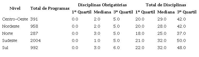 A região Sudeste concentra o maior número de programas de pós-graduação e a maior mediana de disciplinas por programa. A região Sul tem metade da quantidade de programas de pós-graduação, mas a mediana de disciplinas por programa não difere da mediana da região Sudeste. A região Nordeste aparece em terceiro na quantidade de programas de pós-graduação, logo após a região Sul. A mediana das disciplinas obrigatórias oscila de 1 a 3 disciplinas, enquanto o terceiro quartil das disciplinas obrigatórias é de 5, com exceção dos programas da região Sul com 6.