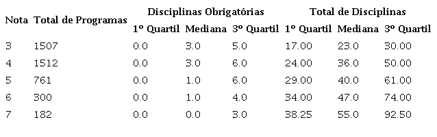 Podemos perceber uma relação crescente entre a nota do programa e o total de disciplinas por programa, tanto na mediana quanto no primeiro e terceiro quartil. Os programas nota 7 tem uma mediana de 55 disciplinas e essa mediana vai diminuindo conforme a nota do programa diminui. Essa relação não está presente nas disciplinas obrigatórias, em que a mediana é 3 disciplinas para programas com nota 3 e 4 e depois a mediana diminui em programas com notas mais altas.