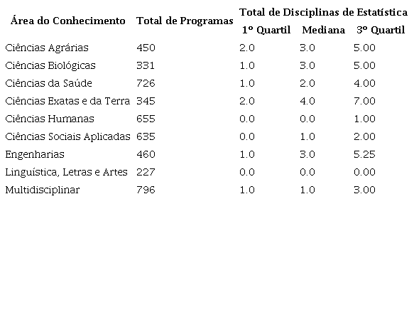 Na Tabela 6 está o detalhamento da quantidade de disciplinas de estatística por programa de pós-graduação. Em todas as áreas os quartis de disciplinas obrigatórias são zero, com exceção de Ciências Agrárias e Ciências da Saúde, que apresentaram uma disciplina obrigatória no 3º quartil.