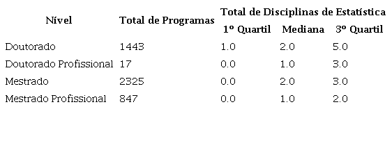 Os programas de doutorado e mestrado acadêmico possuem a mediana de 2 disciplinas relacionadas à estatística, enquanto os programas de doutorado e mestrado profissionais possuem a mediana de 1 disciplina. No terceiro quartil os programas de doutorado e mestrado acadêmicos também possuem valores maiores dos que os programas profissionais.