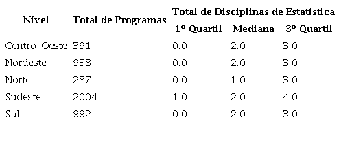 Apesar das disciplinas obrigatórias de estatísticas serem poucas, a ponto de não aparecerem no primeiro quartil dos programas, a distribuição delas está na Tabela 10, a seguir.