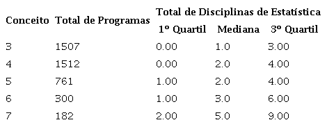 A mediana de disciplinas relacionadas à estatística por programa é crescente conforme o conceito do programa, começando com 1 disciplina em programas com conceito 3 e chegando a 5 em programas com conceito 7. O mesmo comportamento é observado tanto no primeiro quartil quanto no terceiro quartil.