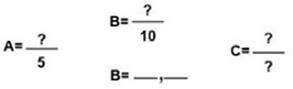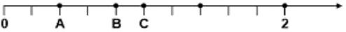 Igualmente relevante no currículo para a Educação Básica (ensino fundamental) é a tradução da representação decimal para a representação fracionária e vice-versa. Solicitou-se aos professores que identificassem as frações 2/5 e 8/10 representadas por pontos, A e B, numa dada reta numérica, na qual o intervalo 0 e 2 estava dividido em 10 partes iguais. Tinham, ainda, de identificar o ponto C que correspondia a 1 (ver Figura 2 ).