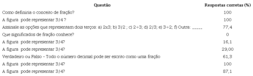 Quando questionados sobre quais significados de fração conheciam, 74,2% dos professores apresentaram respostas que sugerem desconhecimento dos diferentes significados, sendo que 22,6% referiu somente que a fração representa uma parte de um todo e 1 professor não respondeu à questão.