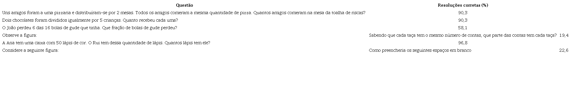 Procurou-se, assim, aferir as ideias dos professores sobre o conceito de fração e suas propriedades, e analisaram-se, ainda, as ideias dos professores sobre os conhecimentos matemáticos e didáticos envolvidos na resolução de alguns problemas, adequados aos alunos do ensino fundamental. Na entrevista, todas as frações representavam números racionais menores ou iguais a 1, por estas serem as frações mais simples (HART, 1981; MAMEDE, 2007).
