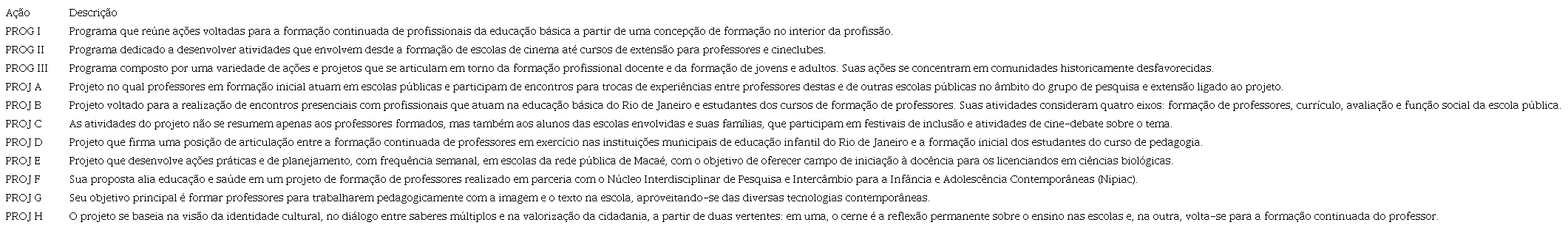 Escolhemos concentrar nosso olhar apenas sobre os programas e projetos de extensão, visto que essas modalidades contemplam a totalidade das diretrizes da extensão e, portanto, permitem uma aproximação mais potente com as perspectivas das disposições e posições para a formação docente ( NÓVOA, 2009, 2017). Ao final desse mapeamento, definimos três programas e oito projetos para a análise documental Quadro 1. Com a leitura dos formulários de registro que sintetizam as propostas dos programas e projetos mapeados, a análise do conteúdo organizou-se de forma a buscar nestes documentos indícios do desenvolvimento das (dis)posições a partir das categorias criadas.
