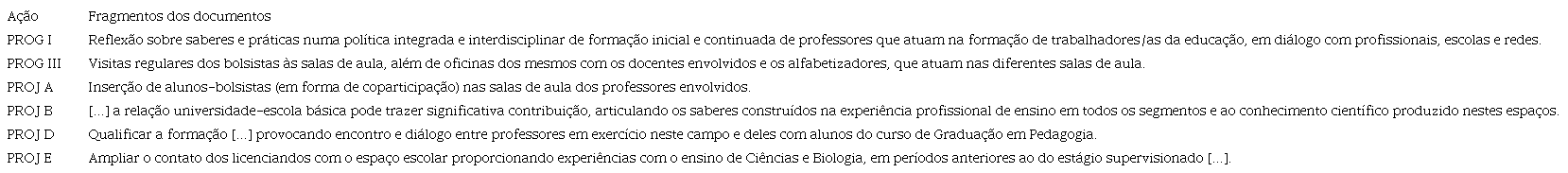 Observamos que são programas comprometidos tanto com as comunidades, as políticas públicas e a consciência crítica quanto com a pesquisa, a produção de conhecimento e a reflexão. Todos se propõem a momentos com grupos de pesquisas e estudos, bem como com estudantes de pedagogia e professores da educação básica em suas atividades, como maneira de articular o alcance dos seus objetivos. Essa constatação vai ao encontro da defesa de Zeichner ( 2010, p. 493) quanto à mudança epistemológica da formação do professor, na qual “[…] diferentes aspectos do saber que existe nas escolas e nas comunidades são incorporados à formação de professores e coexistem num plano mais igualitário com o conhecimento acadêmico”.