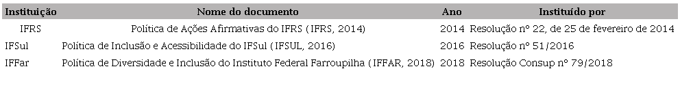 IFFAR. Instituto Federal Farroupilha. Resolução Consup nº 079/2018, de 13 de dezembro de 2018. Aprova a Política de Diversidade e Inclusão do Instituto Federal de Educação, Ciência e Tecnologia Farroupilha. Santa Maria: Reitoria, 2018.Disponível em:https://www.iffarroupilha.edu.br/regulamentose-legisla%C3%A7%C3%B5es/resolu%C3%A7%C3%B5es/item/14719-resolu%C3%A7%C3%A3oconsup-n%C2%BA-079-2018-aprova-a-pol%C3%ADtica-de-diversidade-e-inclus%C3%A3o-do-iffar. Acesso em: 15 mar. 2023.