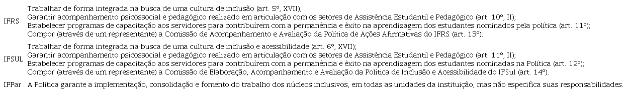 Como observamos, os núcleos institucionais mostram-se como importantes mecanismos para a construção de uma cultura de inclusão e acessibilidade, além de contribuírem para a permanência dos estudantes com deficiência. As políticas do IFRS e do IFSul explicitam as responsabilidades, enquanto a política do IFFar subsidia a implementação, consolidação e atuação dos núcleos, mas não regulamenta quais são as suas incumbências. Os textos institucionais do IFRS (art. 10º, XI) e do IFSul (art. 11º, XI) também garantem condições de atendimento desses dispositivos voltados às ações de inclusão e acessibilidade, mas não são propositivos em relação à efetivação desta garantia ( IFRS, 2014; IFSUL, 2016).