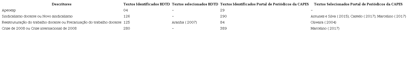 No que tange à pesquisa bibliográfica, foram selecionados artigos publicados no Portal de Periódicos da CAPES (Coordenação de Aperfeiçoamento de Pessoal de Nível Superior) e teses e dissertações disponibilizadas na Biblioteca Digital Brasileira de Teses e Dissertações (BDTD). Os seguintes filtros foram adotados no processo de seleção dos textos: deveriam contemplar as temáticas da precarização do trabalho docente ou da reestruturação do trabalho docente, as atuações da Apeoesp de 2009 a 2014 e os impactos da crise internacional pós-2008. O Tabela 1 sintetiza o processo de buscas 1