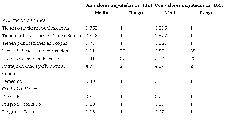 De las variables independientes, se notó que solo “Puntaje de desempeño docente” seguía una distribución normal. Sin embargo, carecía de datos para 43 casos. Por ello, y debido a su tendencia a la normalidad, se decidió realizar una imputación de casos por el método TREND (Promedio) de SPSS (v. 24). No obstante, los datos faltantes eran casos con diferencias considerables en las demás variables independientes frente a los 119 casos restantes. Por estas razones, se crearon cuatro bases de datos en SPSS a partir de la base de datos original en Excel. Dos de ellas (n=162 y n=64) contuvieron los casos con valores imputados para la mencionada variable, y dos de ellas (n=119 y n=37) carecieron de ellos. Se presenta, al respecto, todos los resultados de manera comparativa para evaluar el efecto de la adición de casos con valores imputados.