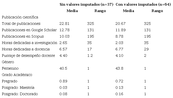 La Tabla 1 nos muestra el resumen de las variables utilizadas en los Modelos 1, 2 y 3. La Tabla 2 hace lo mismo para los Modelos 4, 5 y 6, respectivamente. Se observó que la imputación de valores trae consecuencias significativas para Modelo 3 ( Scopus). Asimismo, parece modificar severamente los coeficientes de todas variables predictores en los Modelos 4, 5 y 6, a excepción del género. En otras palabras, la expansión de la muestra generó cambios considerables en las estimaciones de los modelos ajustados finales (véanse las Tablas 3 y 4).