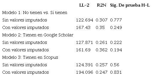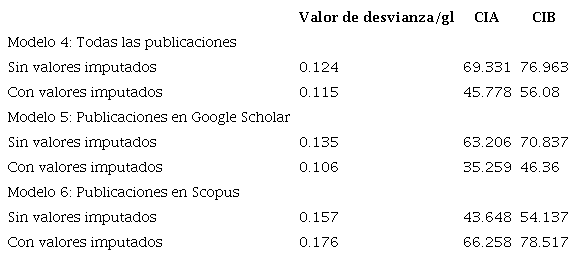 Se deben mencionar algunos patrones en el ajuste de los modelos mostrados en las Tablas 3 y 4. Utilizando valores imputados, los modelos con mejor ajuste, tanto en las regresiones logísticas como gamma, fueron los modelos 2 y 5 ( Google Scholar). Aquellos con peor ajuste fueron los modelos 3 y 6 ( Scopus). Entre los modelos con valores sin imputar no se halló esta relación. Esto se debe a los cambios introducidos por los valores de los casos añadidos. Sin embargo, en todos los casos se hablará solo de resultados con modelos con un ajuste óptimo.