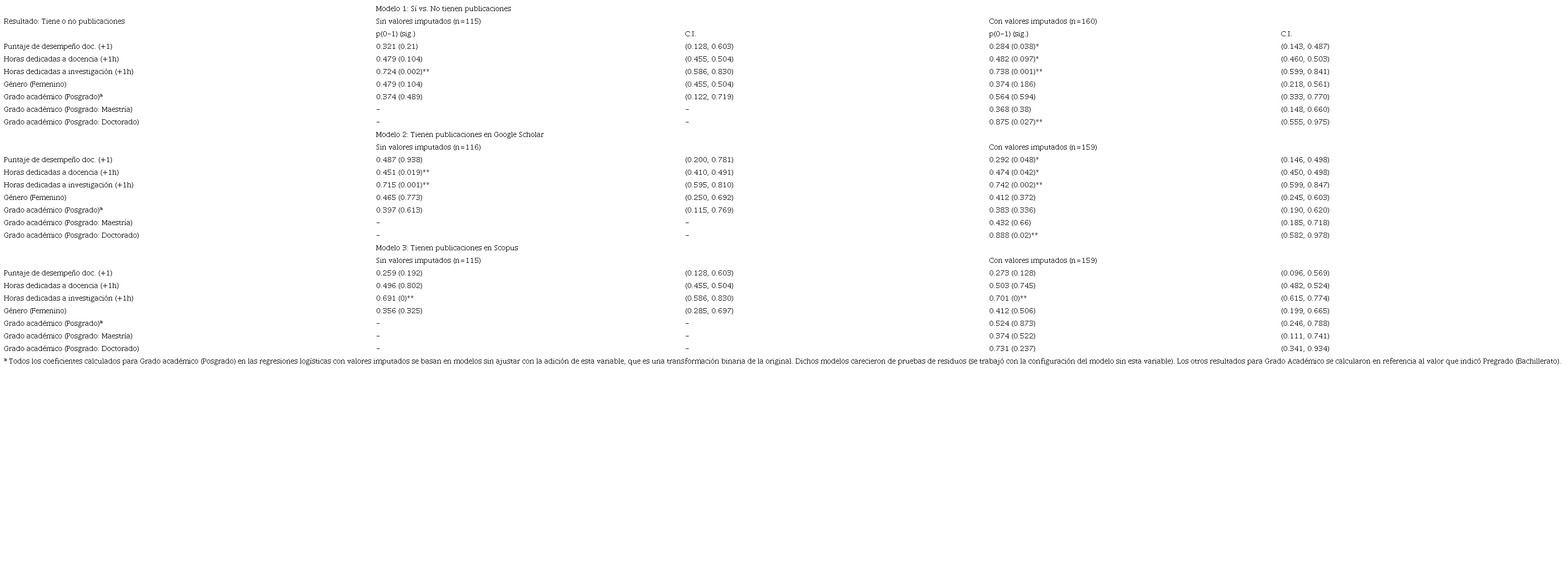 Los modelos convergen en la importancia de las horas de investigación (una hora más aumenta la probabilidad de p=0.5, sin relación, a cerca de p=0.7). También concuerdan en la poca importancia de las horas dedicadas a la docencia (las razones de posibilidad rodean el valor de 1, o p=0.5, indicando falta de relación) como determinantes de la publicación científica. Las demás variables indican relaciones generalmente negativas que se vuelven más importantes utilizando valores imputados, a excepción del grado académico, donde sucede a la inversa. La Tabla 5 confirma también que estos resultados adquieren mayor significatividad con valores imputados.