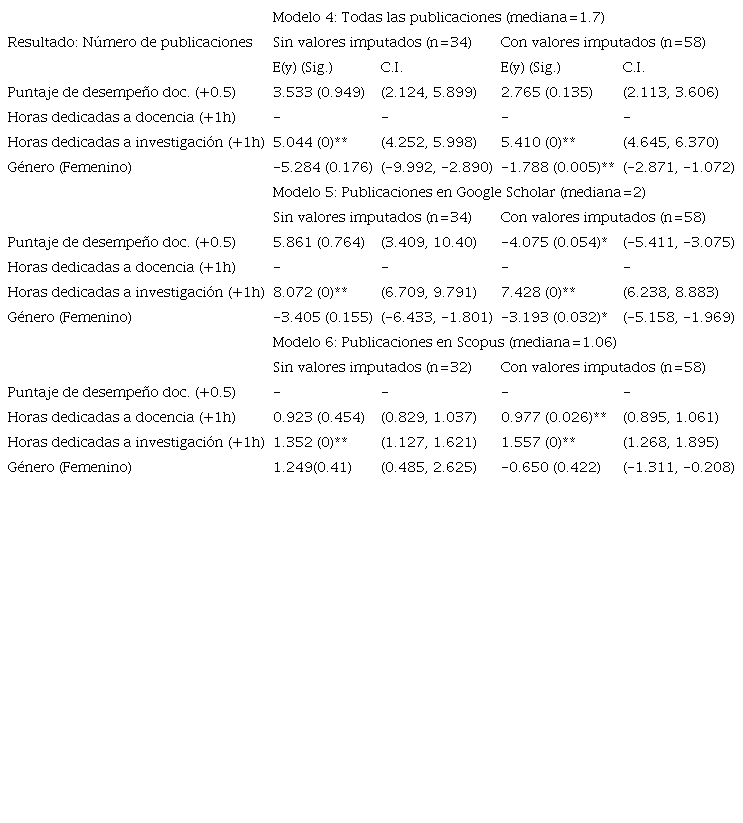 Junto con ellas, se confirma que los determinantes de la publicación en Scopus resultan ser muy específicos. El Modelo 6 ( Scopus) expresa correlación significativa con las horas de desempeño docente. Sin embargo, esto contradice el valor cercano a la significatividad del puntaje de desempeño docente con tendencia negativa en las regresiones logísticas (Modelos 1 y 2). La explicación podría estar en que quienes declaran más horas de investigación en una sola universidad son justamente los que trabajan en ella de manera exclusiva, mientras los demás comparten labores entre varias universidades. Por lo demás, los modelos gamma relacionados con Scopus tienen menor ajuste en general. Esto quizá se deba a la falta de otras variables (por ejemplo, saber escribir en inglés académico, un requisito que no afecta la presencia en Google Scholar).
