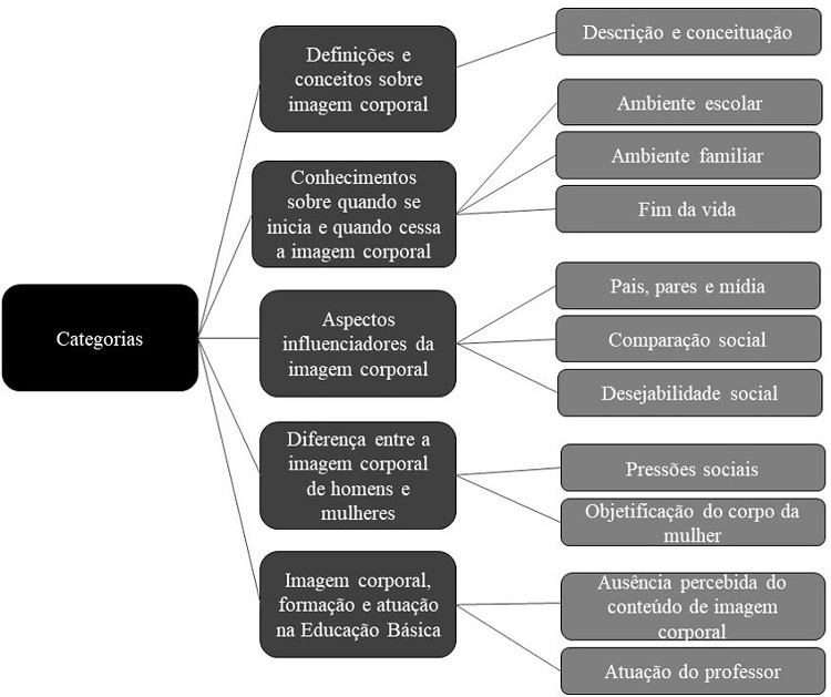 Em relação ao conteúdo das sessões dos grupos focais, cinco categorias emergiram, quais sejam: (1) Definições e conceitos sobre imagem corporal – agrupa relatos dos universitários na tentativa de definir e problematizar o conceito da imagem corporal; (2) Conhecimento sobre quando se inicia e quando cessa o desenvolvimento da imagem corporal – configura as percepções dos universitários a respeito de quando emergem e quando cessam as questões relacionadas à imagem corporal no âmbito do desenvolvimento humano; (3) Aspectos influenciadores da imagem corporal – configura questões existentes na fala dos participantes a respeito dos aspectos socioculturais que influenciam o desenvolvimento da imagem corporal; (4) Diferenças entre a imagem corporal de homens e mulheres – agrupa aspectos que diferenciam a imagem corporal entre os sexos, a intensidade de seus aspectos negativos e a pressão social; (5) Imagem corporal, formação e atuação na educação básica – reúne elementos que contextualizam a formação universitária no curso de licenciatura em educação física, bem como a atuação profissional no contexto educacional.