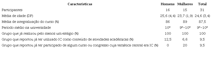 Esta pesquisa contou com a participação de 31 graduandos do curso de licenciatura em educação física de uma universidade federal do Rio de Janeiro. A média de idade foi de 24,6 anos (DP=±3,4). A média de porcentagem de integralização do curso foi de 87,5%. O período médio que os sujeitos se encontravam na universidade estava entre o nono e o décimo períodos, e 100% da amostra já havia realizado pelo menos um estágio supervisionado obrigatório. Apenas 9,5% dos participantes reportaram ter realizado atividades acadêmicas nas quais a imagem corporal era o conteúdo principal da intervenção. Outros dados sociodemográficos podem ser visualizados na Tabela 1 .