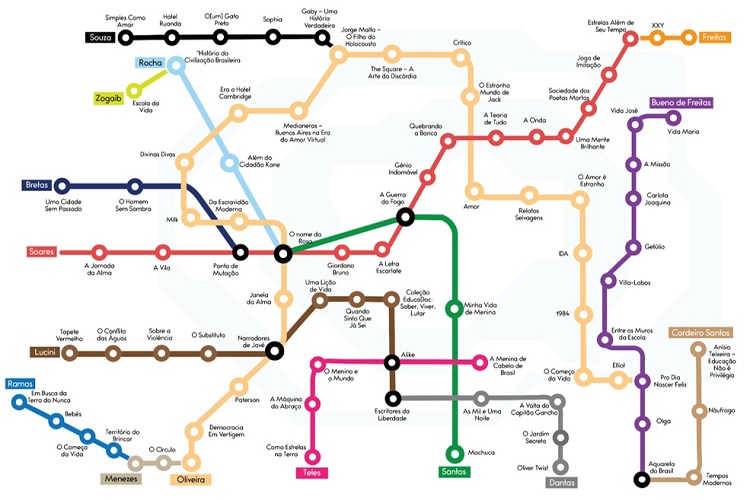Utilizando de um simples exercício de imaginação, podemos pensar a lista descrita no Quadro 2, dos filmes indicados pelos professores, como um mapa conceitual que revela pontos de intersecção entre as escolhas dos docentes. Fazendo uma analogia com um mapa metroviário, por exemplo, em que as estações se estabelecem e se conectam mutuamente, podemos vislumbrar tais filmes como uma espécie de “mapa filmoviário”.