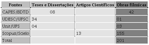 Cabe destacar que, durante a revisão filmográfica, ou o estado da arte fílmica, foram priorizadas nas teses e dissertações dos Programas selecionados, pesquisas que abordassem diretamente algum filme, e não apenas que mencionassem à guisa de reflexão ou de exemplo, como fizemos com os artigos científicos. Se tivéssemos utilizado o mesmo critério o número total se ampliaria acima do descrito.