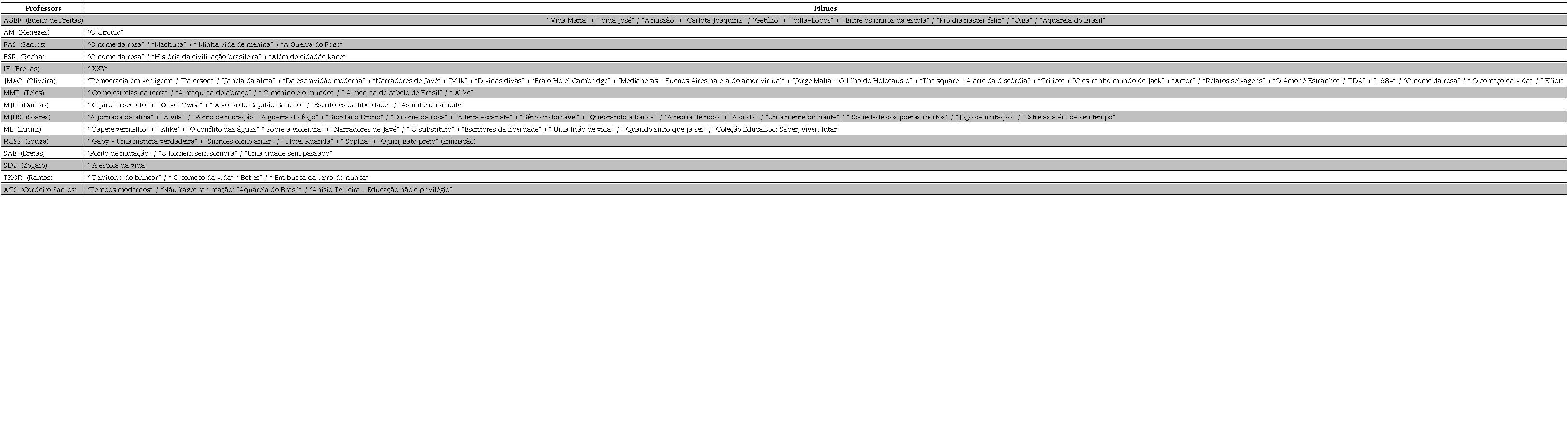 Por meio dos relatos aqui descritos, notamos, na maior parte dos casos, que o uso das obras faz referência aos filmes como um suporte para ilustrar determinado conteúdo. Em outros, eles são mencionados como tendo o mesmo peso de demais recursos pedagógicos, porém a ideia do filme como uma ferramenta para uso docente em prol de determinado tema ou assunto continua explícita. O que não significa menor valor pedagógico, apenas atesta uma dimensão prática recorrente do cinema na escola e na universidade.