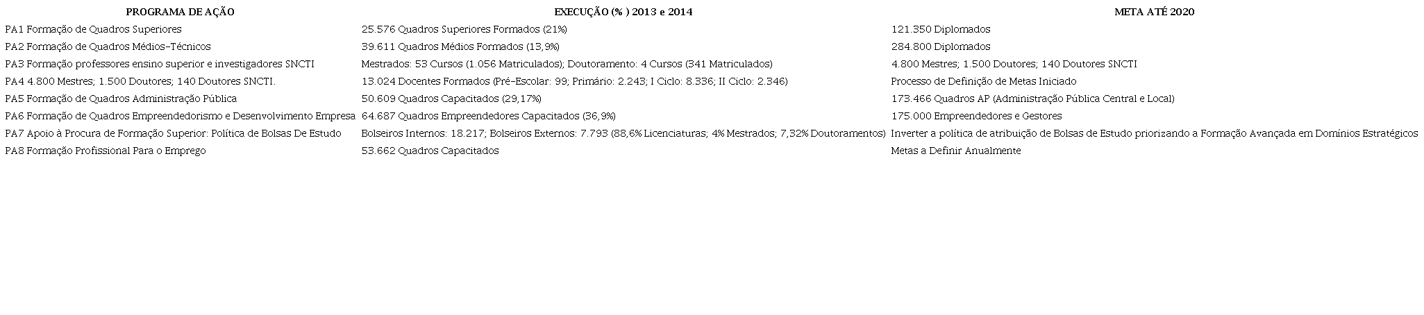 Estas áreas constituem a base para um desenvolvimento sustentado da economia nacional, o que implica a existência de quadros e profissionais angolanos altamente qualificados. Angola enfrenta o desafio da formação de recursos humanos diferenciados, capazes de assegurar o desenvolvimento do País dos diversos domínios da economia, razão pela qual urge garantir a formação de quadros angolanos competentes. Neste contexto, o Programa do Governo 2017-2022 preconiza, em termos de políticas estratégicas de desenvolvimento, e no eixo relativo à estimulação e valorização do capital humano e à promoção do emprego qualificados e remunerador, medidas de política que visam desenvolver e capacitar os recursos nacionais. ( ANGOLA, 2019b, p. 1466).
