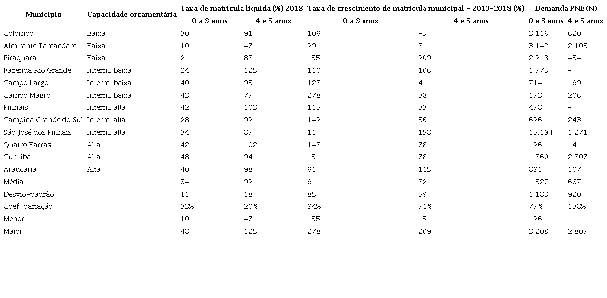 Abstract: The objective of this article is to analyze the context of the provision of early childhood education, in municipalities that have different budgetary capacities, and to present possible relationships between availability of resources, expansion of access and conditions of supply in early childhood education. The methodological resource was the analysis of educational and financing indicators selected from official databases and the creation of a synthetic index based on indicators of conditions of supply of early childhood education observed in the region. The municipalities that make up the first metropolitan ring of Curitiba constitute the spatial reference of the study that uses as a time frame the year 2018. The analysis of the results indicates that, for this group of municipalities, the budgetary capacity seems to be more associated with the student/year expenditure of basic education and the conditions of provision of early childhood education than with the expansion of access for children from 0 to 5 years old. In some cases, the expansion may be associated with lower rates of supply conditions, which may demonstrate that the expansion has not always been accompanied by the guarantee of the necessary conditions for the guarantee of a minimum standard of quality in early childhood education and the materialization of the right to education of children from 0 to 5 years old.