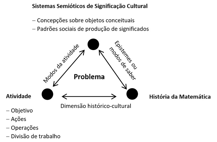 A relação dialética entre filogênese e ontogênese, tal como se manifesta na relação entre a atividade humana e o saber matemático social e historicamente constituído, indica o potencial da história da matemática como suporte para a organização do ensino que visa desenvolver o pensamento teórico dos alunos – com problemas cotidianos, mas também para além do foco nas situações do dia a dia. Assim, propomos que o sentido dos problemas matemáticos escolares tome uma dimensão que associe elementos lógico- históricos da história da matemática (a sua historicidade no entendimento dialético do termo), o conceito da atividade de sala de aula (como aquela que busca relacionar aspectos da unidade dialética da filogênese e ontogênese), e o que chamamos sistemas semióticos de significações culturais ( Figura 1).