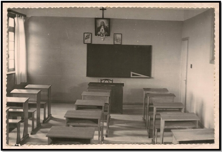 A sala de aula foi o lugar privilegiado nas memórias dos sujeitos entrevistados. Assim, apresentamos uma fotografia de uma das salas de aula na década de 1950, que permite observar classes individuais enfileiradas, quadro-negro no centro com quadros acima, com símbolos religiosos e nacionais.