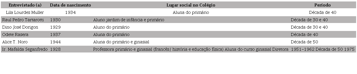 Com o intuito de ter acesso às representações das práticas escolares, foram realizadas entrevistas com ex-alunos e ex-professores 7. Como procedimento, as entrevistas foram previamente agendadas, após realizadas e transcritas. Em quatro situações, os próprios alunos contribuíram com seu acervo pessoal, ou seja, com atividades escolares, fotografias, boletins escolares e objetos simbólicos fotografados para uso analítico na pesquisa 8. A organização da entrevista com uso de questões norteadoras, com possibilidade de intervenção, foi a escolha, de modo a se tornarem momentos agradáveis para os entrevistados. No quadro, a seguir, é possível identificar os entrevistados, data de nascimento, sua vinculação à instituição e período.