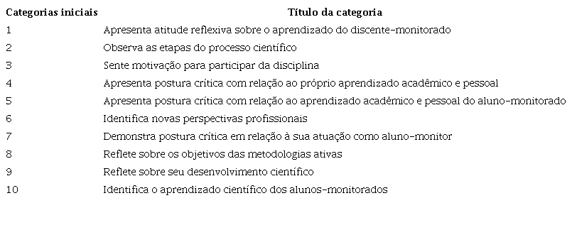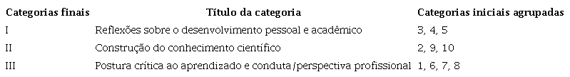 Na etapa de categorização, foi realizado o reagrupamento das categorias caracterizando as categorias finais: I) Reflexões sobre o desenvolvimento pessoal e acadêmico; II) Construção do conhecimento científico; e III) Postura crítica ao aprendizado e conduta/perspectiva profissional ( Tabela 2). Por fim, procedeu-se à elaboração dos metatextos, os quais apresentaram caráter descritivo, interpretativo e reflexivo.