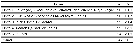 A pesquisa teve uma primeira fase de caráter bibliográfico. Em maio de 2021, por meio do uso dos descritores “Jornadas de 2013” e “Junho de 2013”, nas bases da Scientific Electronic Library Online (Scielo), Coordenação de Aperfeiçoamento de Pessoal de Nível Superior (Capes) e Google Acadêmico, foram levantados 142 produtos, entre teses, dissertações, artigos, livros e capítulos sobre as Jornadas, conforme Tabela 1. Os produtos foram divididos em 5 blocos temáticos, sendo que o quinto bloco (“Outros”) se referia a produtos que não tinham relação direta ou indireta com o tema “dimensões educacionais”.