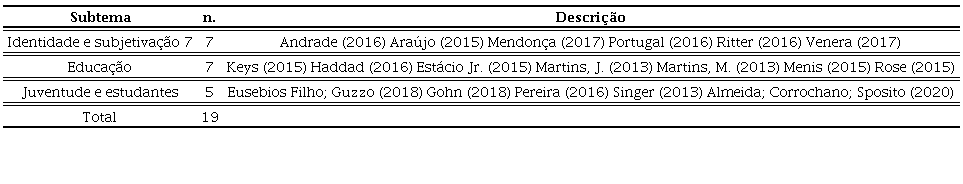 Neste artigo, analisamos especialmente os produtos selecionados para o Bloco 1, com o amplo tema “Educação, juventude e estudantes, identidade e subjetivação”. Dos 26 produtos levantados pela pesquisa bibliográfica, 19 foram selecionados para a documentação. Para fins de análise, esses produtos foram divididos em três subtemas: “Educação”, “Juventude e Estudantes” e “Identidade e subjetivações”, conforme a Tabela 2.