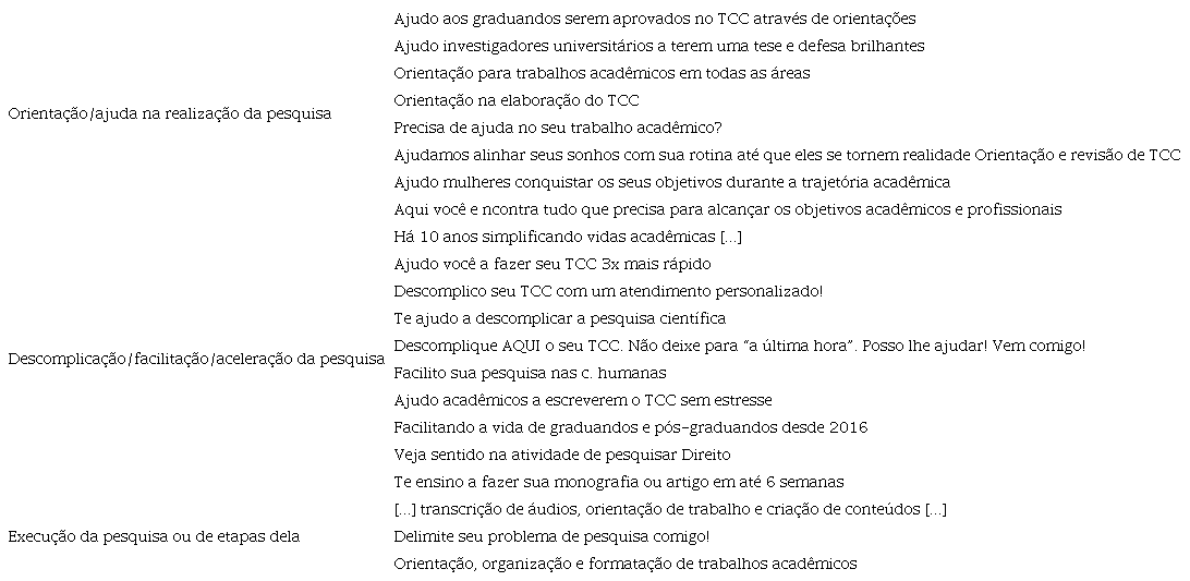 Em relação às mensagens presentes na bio dos perfis, constatamos que elas giram em torno da constituição de um mercado de orientações paralelas/concorrentes à orientação formal nas Instituições de Ensino Superior (IES). Essa questão mais genérica pode ser destrinchada em três núcleos mais eminentes: 1) orientação/ajuda na realização da pesquisa - onde constam as mensagens que incluem os termos/expressões orientação, ajuda, encontrar o que precisa e variações. Essa categoria manteve apenas as mensagens que mencionam uma orientação genérica, sem qualificá-la ou diferenciá-la da orientação formal; 2) descomplicação/facilitação/aceleração da pesquisa – categoria marcada por termos que indicam uma orientação diferenciada, seja porque implica maior rapidez ou aceleramento da pesquisa, simplificação, descomplicação ou situações congêneres, como tornar a pesquisa mais fácil, com sentido ou livre de estresse; 3) execução da pesquisa ou de etapas dela – nessa categoria se consideram mensagens que vão além da orientação, mas oferecem o serviço de execução de etapas da pesquisa, como delimitação de problema ou objetivo, definição do desenho metodológico, realização da coleta ou análise de dados, formatação e organização do texto etc. A seguir, apresentamos o Quadro 1, contendo as frases selecionadas em cada um desses núcleos, destacando termos ou expressões em itálico que guiaram a categorização.