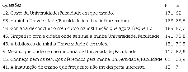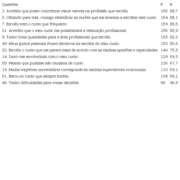 Ainda com relação à carreira, pode-se observar no Quadro 1 que 59,1% consideram que sua trajetória universitária corresponde às expectativas vocacionais (Item 19) e 58,1% afirmaram estar no curso que sempre sonharam (Item 51). Esses itens evocam o processo de escolha do curso, sugerindo que 60% dos participantes no estudo compreendem que a sua trajetória universitária corresponde às suas expectativas vocacionais e que estão no curso sonhado. Soma-se a isso o fato de que os gostos pessoais de 80,6% dos participantes na pesquisa foram decisivos na escolha do curso (Item 49).