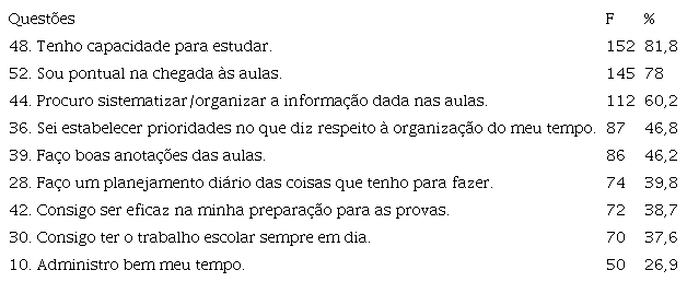 Na pesquisa de Guerreiro-Casanova e Polydoro (2011) os participantes percebem-se menos capazes de planejar, organizar e executar ações após vivenciar as tarefas acadêmicas. No caso desta pesquisa aqui apresentada, é possível observar que os números na dimensão estudo são bem menores que na dimensão carreira, especialmente quanto à dificuldade dos estudantes em administrar seu tempo, o que faz com que as atividades escolares não fiquem em dia.