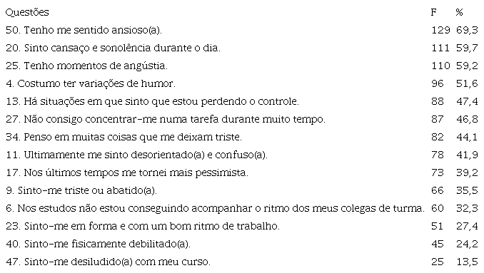 Quase 70% dos universitários relataram sentir-se ansiosos (Item 50), sendo que destes, 51,6% se queixam de oscilação de humor (Item 4) e 35,5% sentem-se abatidos ou tristes (Item 9).