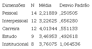 A dimensão interpessoal foi a que apresentou a segunda média mais baixa, 3,22625 ( Quadro 4, a seguir), diferente do encontrado por Joicilaine Souza e Sérgio Domingues (2019) em que a média identificada foi de 3,82. Esse dado indica os efeitos do isolamento social decorrente da pandemia de COVID 19 nas interações entre os estudantes.