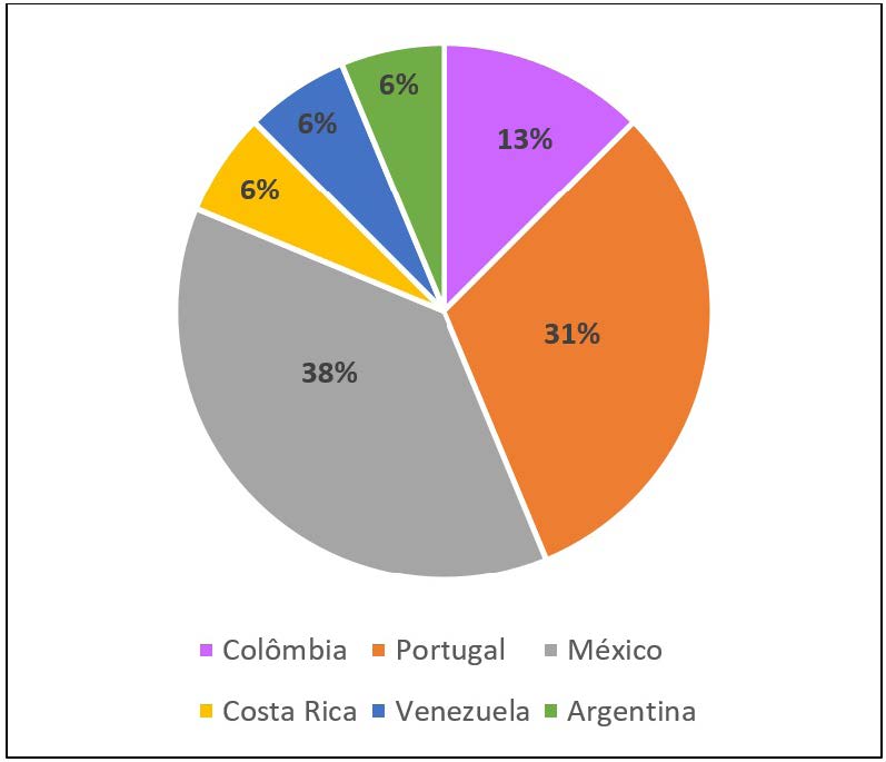 Como destacado na figura 1, o México é o país com o maior número de publicações em que Paulo Freire é utilizado como referencial teórico, com 38% dos artigos identificados. Em seguida, Portugal com uma quantidade significativa de 31%, Colômbia com 13% e os demais países com apenas 6% cada um.