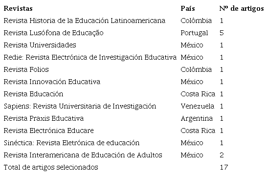 Como destacado no Quadro 2, o número dos artigos que foram encontrados segundo as especificações dos filtros utilizados foi de 17. Observa-se que para um recorte temporal considerando a última década, contemplando países Ibero-americanos com exceção do Brasil, a quantidade de artigos é pequena. Além disso, nota-se que a quantidade de publicações por revista também é limitada, sendo a Revista Lusófona de Educação, com 5 artigos entre 2007 e 2019, o periódico com o maior número de publicações que abordam questões relacionadas à pedagogia freireana, e o México o país com o maior número de periódicos identificados, 5 no total de 12.