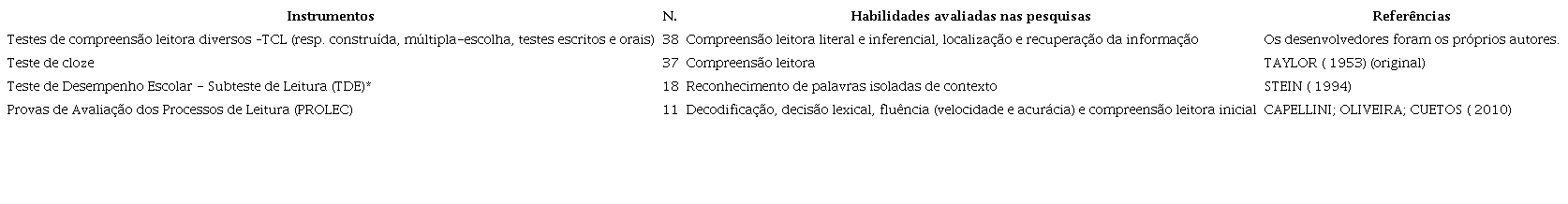 Os instrumentos usados para a testagem foram bastante variados: empregaram-se em torno de 64 tipos diferentes para medir as habilidades de leitura, e alguns estudos valeram-se de mais de um. A seguir, são apresentados os quatro principais instrumentos ou técnicas de testagem usados nas pesquisas selecionadas.