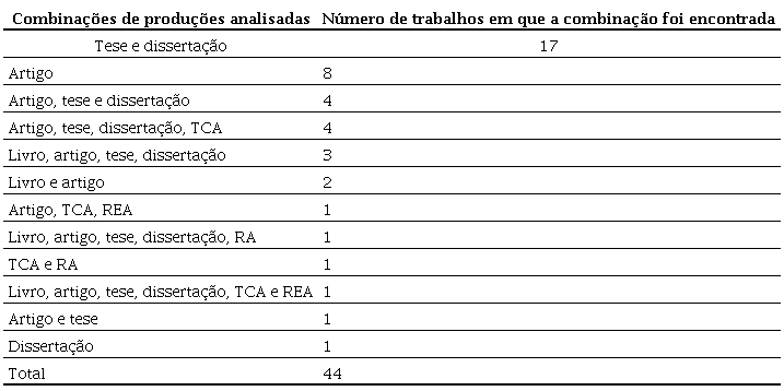 De acordo com a Tabela 1, as combinações mais comuns nos trabalhos foram tese e dissertação, e artigo, tese e dissertação. Chama atenção a pouca presença de livros como objeto de estudo das pesquisas e os artigos serem a produção mais presente isoladamente.