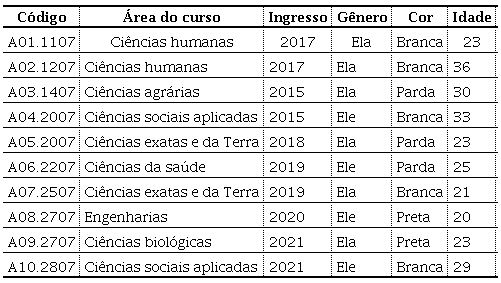 O corpus, cuja análise é expressa neste artigo, é composto por entrevistas em profundidade com estudantes que responderam a um survey aplicado em 20214 e que se disponibilizaram a serem entrevistados. Entre as 1.463 respostas válidas, foram identificados 42 respondentes que declararam renda familiar de até dois salários mínimos e pais sem escolarização superior. O Quadro 1 descreve as características demográficas dos dez participantes cujas entrevistas são analisadas neste artigo.