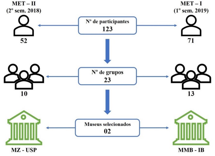 Os participantes cursaram as disciplinas Metodologia do Ensino de Biologia II (MET II), no segundo semestre de 2018, e Metodologia do Ensino de Ciências I (MET I), no primeiro semestre de 2019. Em cada uma delas, um museu foi visitado, com a finalidade de fornecer elementos para o planejamento das atividades que envolvessem visitas a esses mesmos locais. Dentre os tópicos discutidos nas disciplinas estão AC, CTSA e QScC em contextos de educação formal (escolar) e não formal (museus de ciências), com a finalidade de apoiar os futuros professores para elaboração das atividades didáticas. Os dois museus visitados foram o Museu de Zoologia da Universidade de São Paulo (MZ-USP) e o Museu de Microbiologia do Instituto Butantan (MMB-IB). A descrição detalhada das disciplinas e as atividades desenvolvidas pelos licenciandos podem ser encontradas em outras publicações relacionadas à pesquisa ( PUGLIESE, 2015; - MILAN, 2020; - SCALFI; ISZLAJI; MARANDINO, 2020; - COLOMBO JUNIOR; LEITE; MARANDINO, 2021).