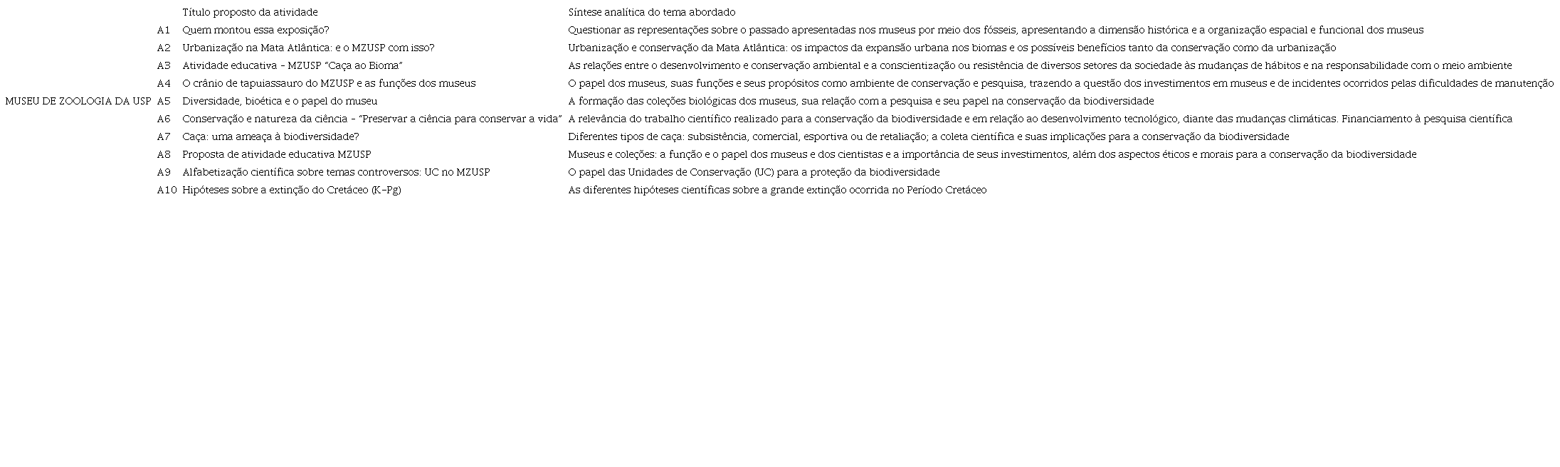 Apresentamos os resultados obtidos com base nos temas selecionados pelos licenciandos das duas disciplinas, a partir da visita aos dois museus indicados. As atividades de 1 a 10 se referem ao MZ-USP, enquanto as de 11 a 23, ao MMB-IB. Na tabela a seguir, encontram-se as informações sobre o museu visitado, os títulos de cada atividade e os temas explorados pelos grupos que elaboraram as atividades (Tabelas 1a, 1b).