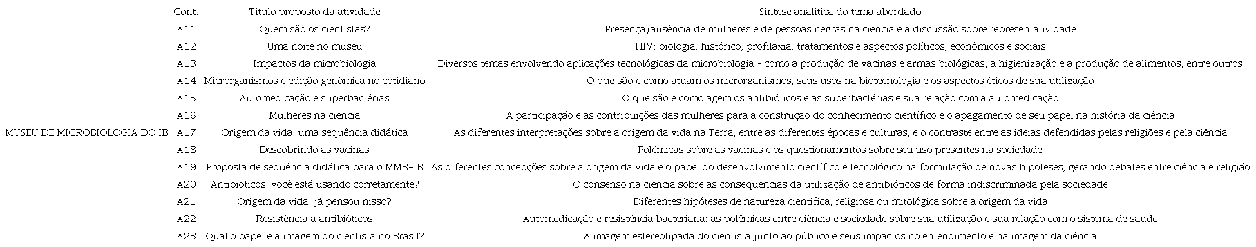Os 23 temas selecionados foram pautados nas exposições dos museus visitados, como orientado inicialmente. Em outro trabalho, que analisou dados da mesma pesquisa, Scalfi, Izslaji e Marandino ( 2020) buscaram caracterizar os temas, as estratégias didáticas, as possibilidades e os desafios na produção dessas atividades pelos licenciandos. Dentre os resultados, destacamos que algumas das atividades propostas ampliaram as possibilidades temáticas para além das apresentadas pelos museus, trazendo novos temas ou novas abordagens aos temas trabalhados nas exposições. Portanto, apesar das atividades terem sido elaboradas a partir das visitas aos museus e serem baseadas em suas exposições, os licenciandos tinham a liberdade de escolher outros conteúdos ligados às exposições, mas que poderiam ir além delas.